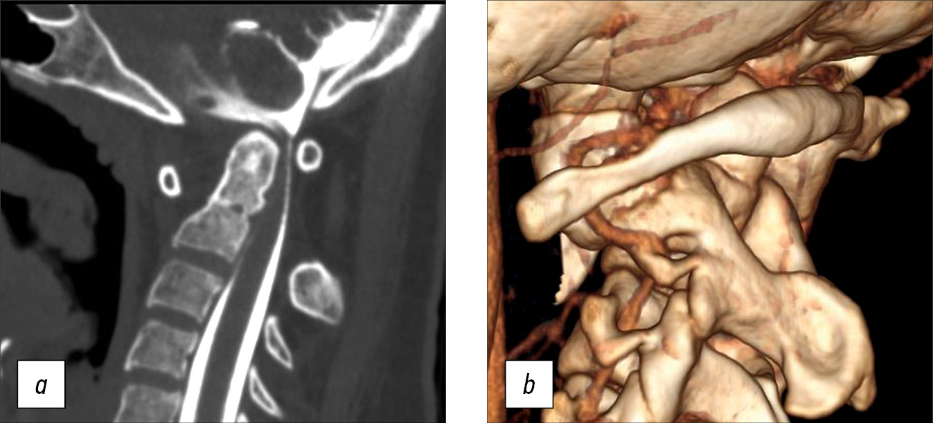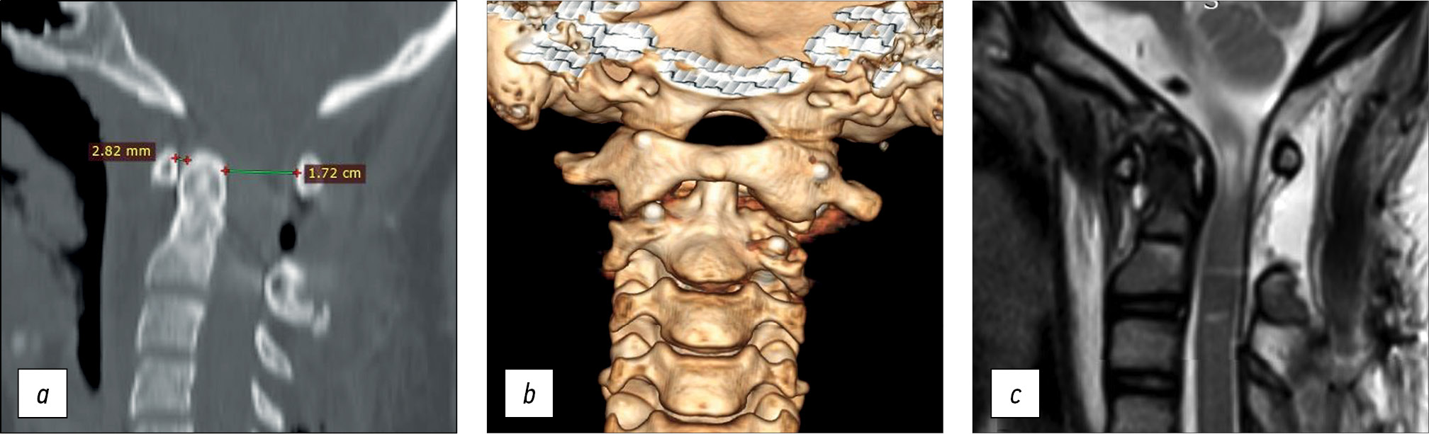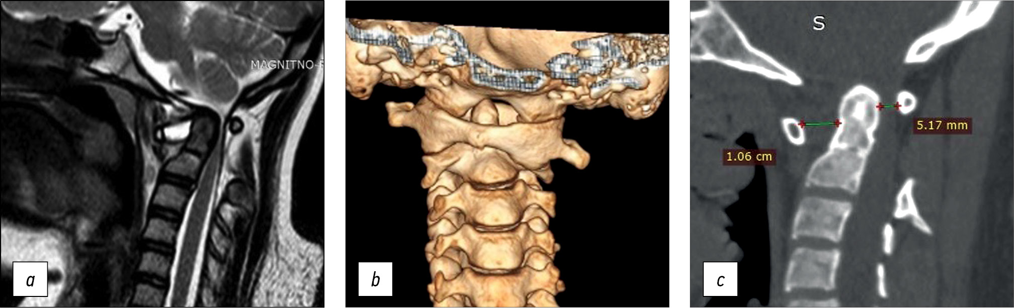 Fig. 2. Instrumental methods of examination: a — MRI picture of transligamentous subluxation with spinal canal stenosis and myelopathy at the level of C1-C2, b — 3D CT reconstruction, c — CT scan of the cervical spine, sagittal slice with visualization of disturbed craniovertebral relations. MRI — magnetic resonance imaging, CT — computed tomography.