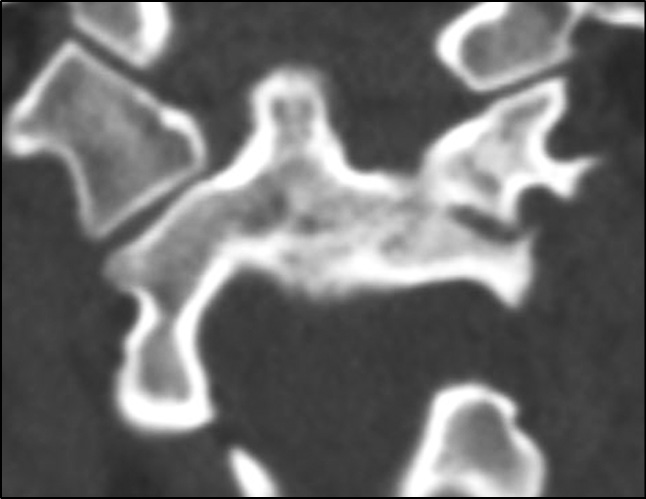 CT revealed gross violations of craniovertebral relationships: the Cruveilhier joint gap (atlantodental interval [ADI]) was 1.06 cm, and the space available for the spinal cord at the C1 level (SAC C1) was 5.17 mm. These changes indicate gross stenosis of the spinal canal. A bone block developed in the left lateral atlantoaxial joint (Fig. 3)