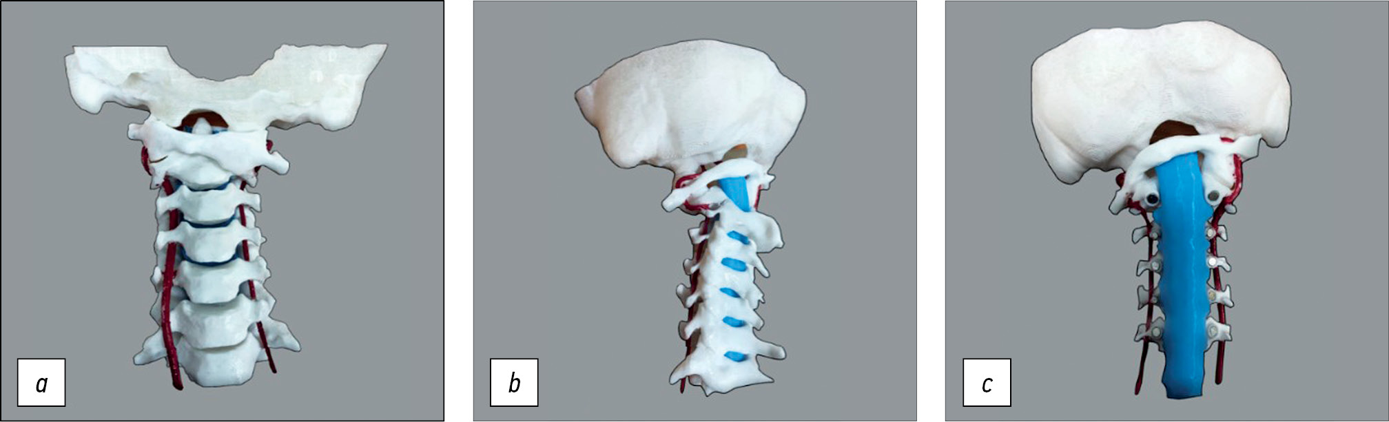 Fig. 5. 3D model of the patient’s cervical spine with visualization of the a. vertebralis and spinal cord: a — anterior view, b — lateral view, c — posterior view with the cervical vertebral arches removed.
