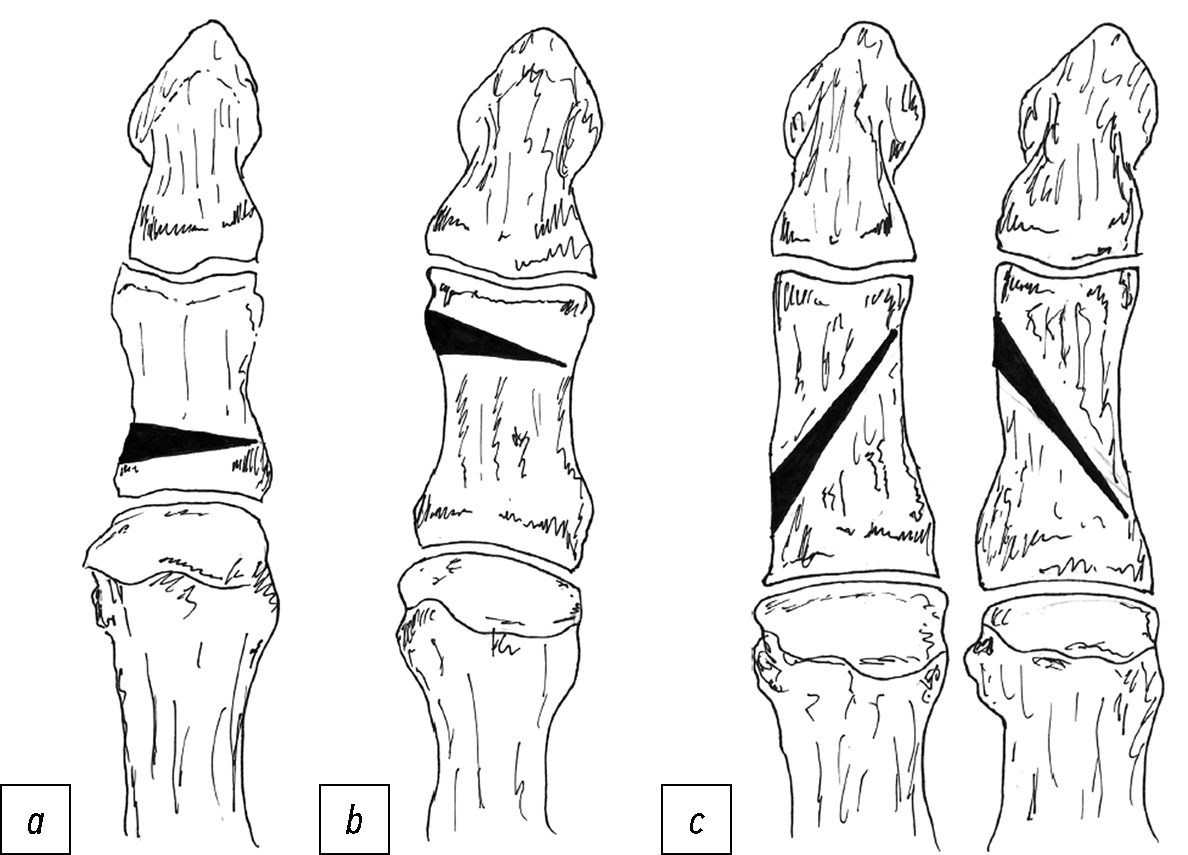 Рис. 3. Проксимальная (a), дистальная (b) и косая (c) остеотомия Akin [35].