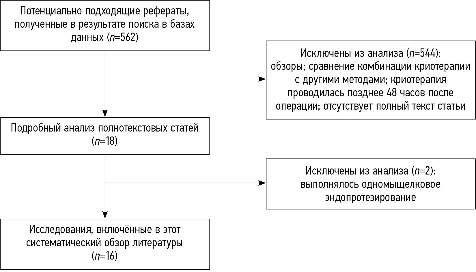 Поиск литературы проводился по ключевым словам «криотерапия», «эндопротезирование коленного сустава» в базах данных Medline.ru, «КиберЛенинка», E-Library. Для баз данных PubMed и Cochrane ключевыми словами были «cryotherapy», «knee arthroplasty». Дата проведения поиска — 01.07.2023 г. Ограничение поиска по языку и времени публикации и фильтр для баз данных Medline.ru, E-Library, «КиберЛенинка» и Cochrane не применялись. При поиске в базе данных PubMed использовался фильтр по типу статей, из поиска были исключены обзоры, систематические обзоры и статьи с метаанализом данных.