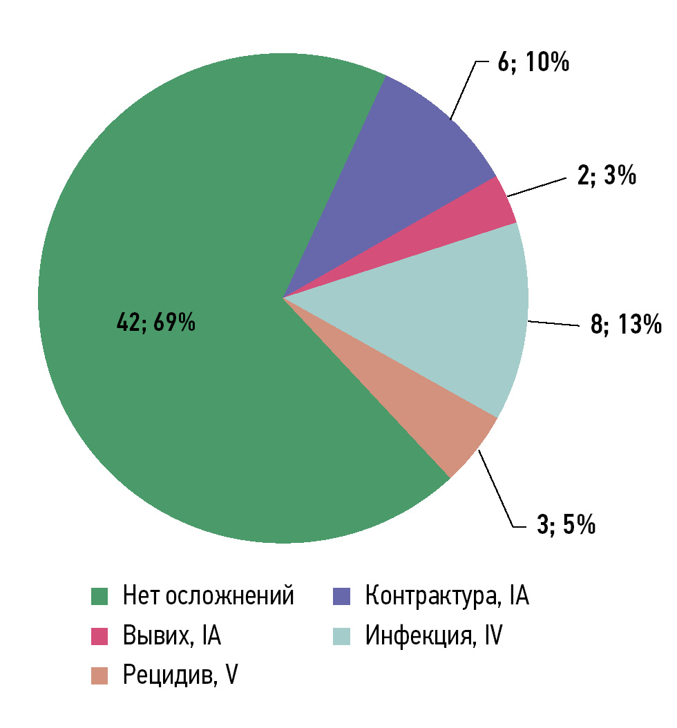 При эндопротезировании тазобедренного сустава предпочтение отдавалось конструкциям, позволяющим достичь отведения оперированной конечности, в ряде случаев для достижения отведения у маленьких детей стандартные ортезы дополнялись шинами Виленского. Верхняя конечность ортезировалась абдукционным ортезом. У всех пациентов, перенёсших технически сложное эндопротезирование плечевого либо тазобедренного сустава, обосновано применение иммобилизации конечности в отводящем ортезе сроком на 5–6 недель с целью профилактики вывиха. Следует отметить, что онкологическое эндопротезирование в детском возрасте сопряжено с развитием ряда осложнений. В настоящее время общепринятой считается классификация осложнений эндопротезирования по шкале E.R. Henderson (2014) [22]. Осложнения эндопротезирования были отмечены у 19 (31,1%) пациентов (рис. 4).