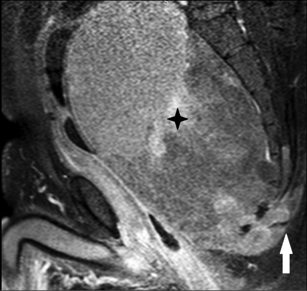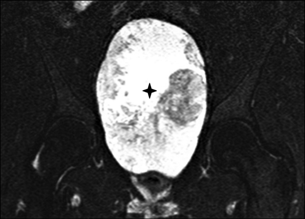 Fig. 1. T2 SPAIR coronal MRI showing a heterogeneously hyperintense tumor occupying a significant portion of the pelvic cavity (asterisk). Pronounced heterogeneity of the signal is due to areas of hemorrhage.