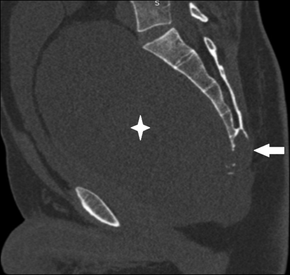 Fig. 3. CT in the sagittal plane, there is a lytic focus of destruction of the C4, C5 and coccygeal vertebrae (arrow), a massive soft tissue component in the pelvic cavity, reaching the level of the L5 vertebra (asterisk).