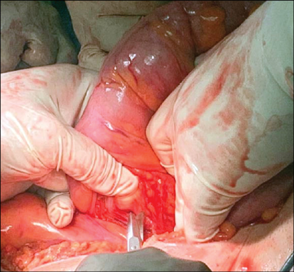 Under endotracheal anesthesia, anterior access was performed in the supine position. A lower midline laparotomy was then performed to mobilize the intestinal loops and ablatively mobilize the tumor from the surrounding tissues and the anterior surface of the proximal sacrum to the S3 level (Fig. 4). Provisor sutures were applied to the anterior abdominal wall, and the patient was then turned to the face-down position for posterior midline access to the sacrum and coccyx (Fig. 5).