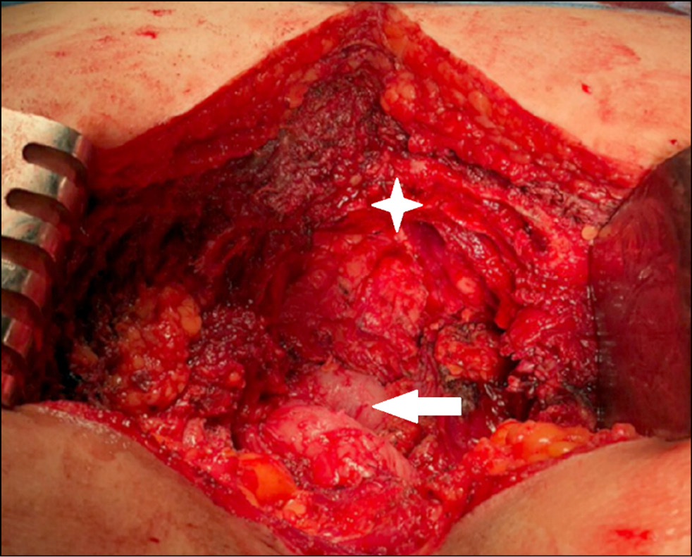 Fig. 6. Posterior view of the wound after tumor removal. The image visualizes the edge of the resection of the sacrum at the S3 level (asterisk), rectum (arrow).