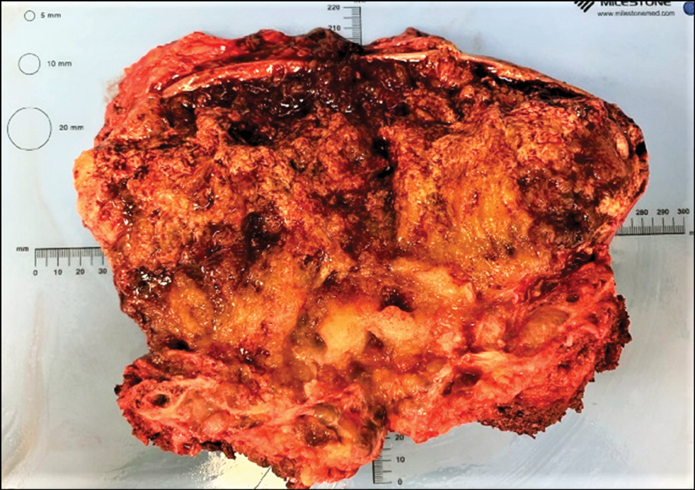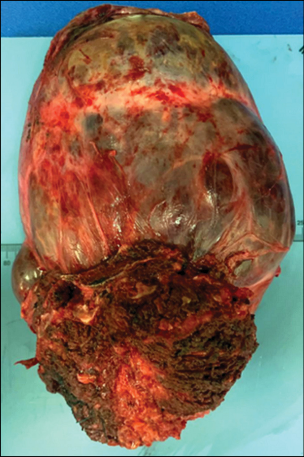 A tumor and a fragment of the sacrum with soft tissues measuring 20 × 11 × 10 cm were sent to the pathology department (Fig. 7). The tumor was a densely elastic lumpy nodule with a diameter of approximately 12.5 cm and was covered by a thin translucent capsule. Its content was red-blue and translucent. Along the edge, areas of bone density with several red dense fibers measuring 7.0 × 9.0 cm were defined. The node section presented multiple cystic cavities of varying sizes. Within these cavities, a dense mass with a lobular-grained appearance and a yellowish–pink liquid content (approximately 200 mL in volume) was observed. The surrounding soft tissue had varying textures, with rough areas of red–gray and yellowish–brown color. In some places, dirty yellow foci and hemorrhages injected by vessels were noted. The bone adjacent to the saw cut easily. Grayish shiny lobular soft tissue was present both inside and outside the bone during sawing (Fig. 9).