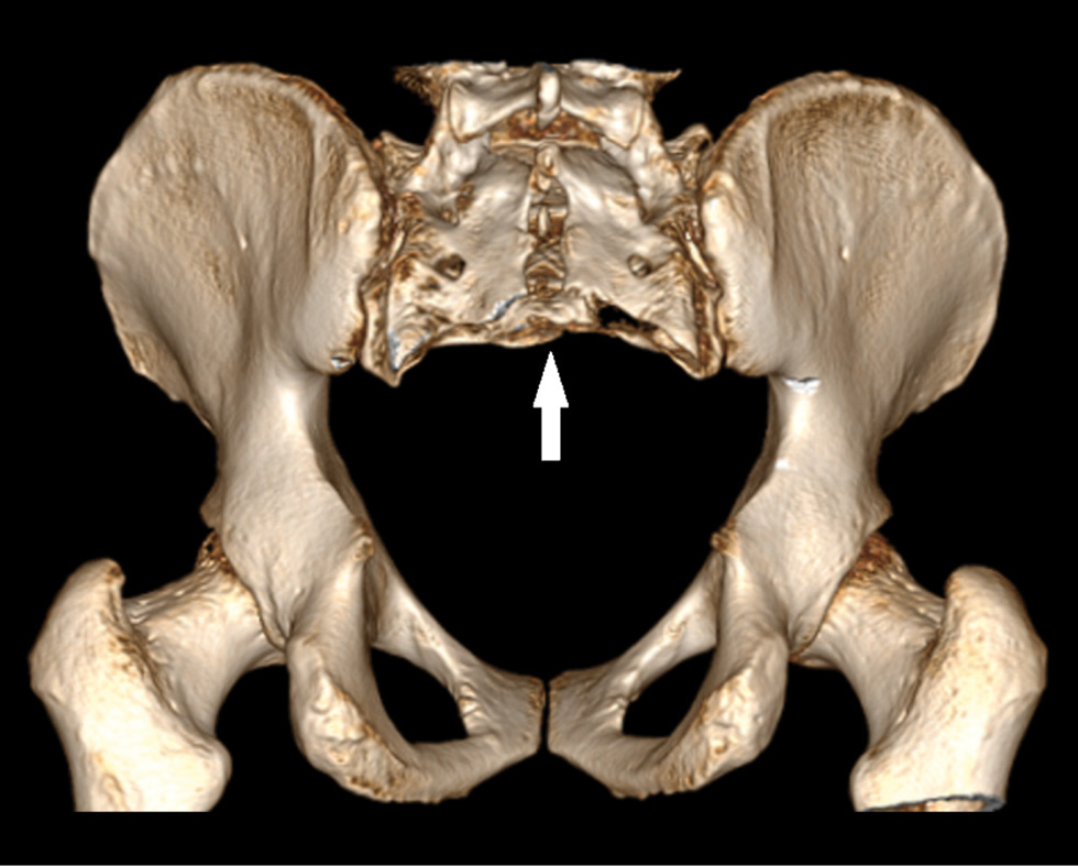 Fig. 8. Three-dimensional CT reconstruction after surgery, posterior view. Resection of the sacrum at the level of the S3 vertebra (arrow).
