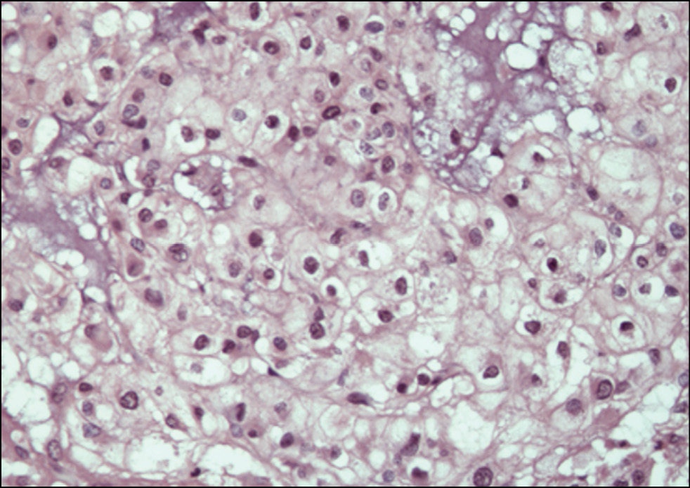 Fig. 10. Micrograph. Conventional chordoma with characteristic physaliform cells with pronounced vacuolization of the light cytoplasm. Hematoxylin and eosin staining. ×400.