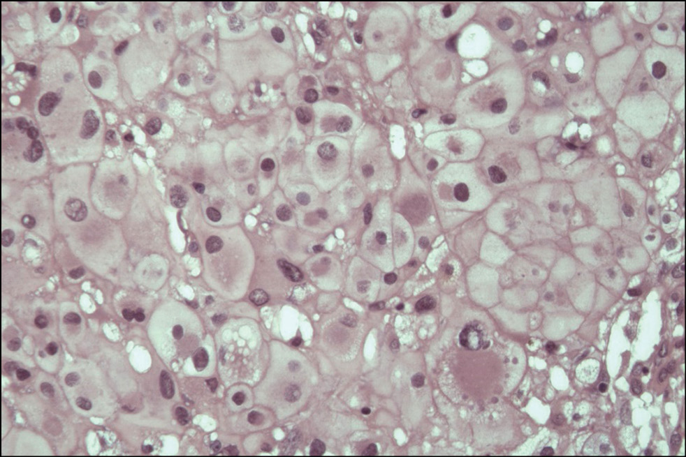 Histological examination of the surgical material revealed a solid neoplasm composed of strands or nests of epithelioid-type cells located in the mucoid intercellular matrix. The pathologic tissue was divided into lobules of different configurations and sizes by connective tissue layers. The tumor cells had large, rounded nuclei with moderate atypia and prominent nuclei. The cytoplasm was abundant and pale, with numerous cytoplasmic vacuoles, also known as physaliform cells (Fig. 10). In addition, epithelium-like cells with dense eosinophilic cytoplasm and weakly expressed vacuolization were found (Fig. 11). The cell population was predominantly mononuclear but also included binuclear and multinuclear cells, as well as cells with a ring-shaped vacuolized cytoplasm with the nucleus displaced to the cell membrane. Mitotic activity was low, and single atypical mitoses were detected. The tumor exhibited densely arranged syncytium-forming cells with a poorly expressed intercellular mucoid matrix in some areas, whereas other areas showed a predominance of the latter with only a few tumor cell islets. In addition, numerous necroses and hemorrhages were observed throughout the tumor.