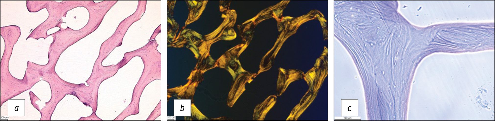 Fig. 3. Histological examination. Microscopy: a — bright field, hematoxylin-eosin, magnification ×50; b — polarized, picrosirius red, magnification ×50; c — phase contrast, hematoxylin-eosin, magnification ×100