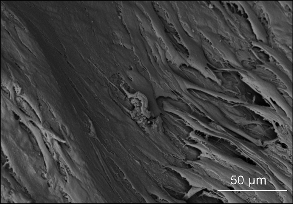 Scanning electron microscopy of the xenogenic bone matrix revealed a confluent monolayer of adherent rabbit BMSCs cells on the bone-plastic material surface in the form of a suspension due to gravity. Rounded cells, which were distant from each other, were identified (Fig. 4). After 4 days of cultivation on the matrix surface, the cells had a longitudinally elongated shape and spread out while tightly adhering to each other. Newly synthesized collagen fibers were visible between the cell edges and underlying matrix. The cells measure approximately 80 μm in the longitudinal direction and 10–12 μm in the cross section. Confluent monolayer formation within 6 days indicates an ideal interaction between the cell culture and bone-plastic material. This may be because of the absence of cytotoxic substances in the matrix, optimal roughness, and good adhesive properties of the matrix surface, which are suitable for focal contact formation by bone marrow stromal cells and their adhesion, spreading, and proliferation. Cell spreading on the substrate is a mechanobiologic factor that stimulates cell division in adherent cultures. The supporting surface of the matrix is assumed to have a positive charge.