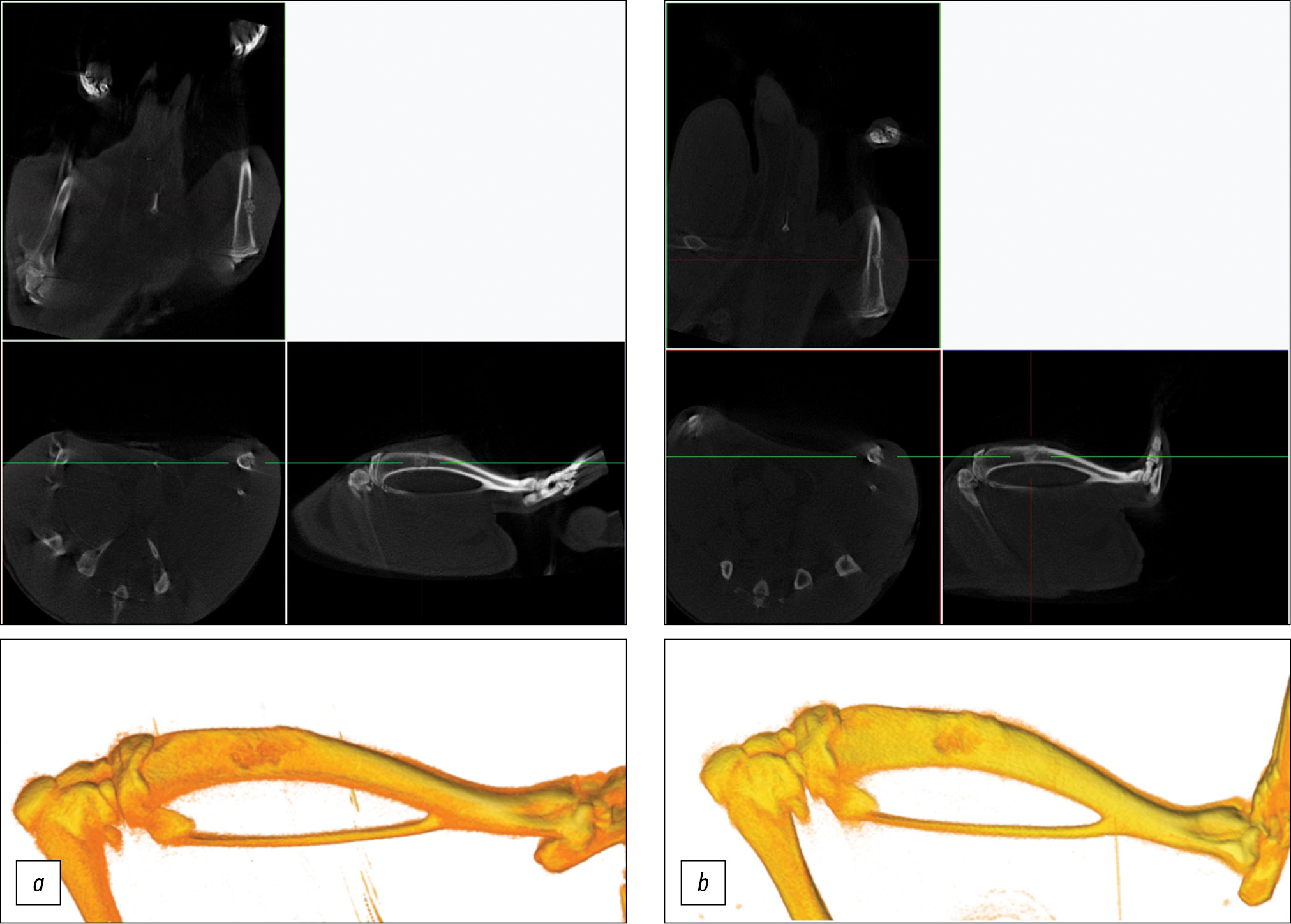 Fig. 6. Orthogonal projections and 3D model of the rat tibia: a — at the time of implantation, b — after 30 days.
