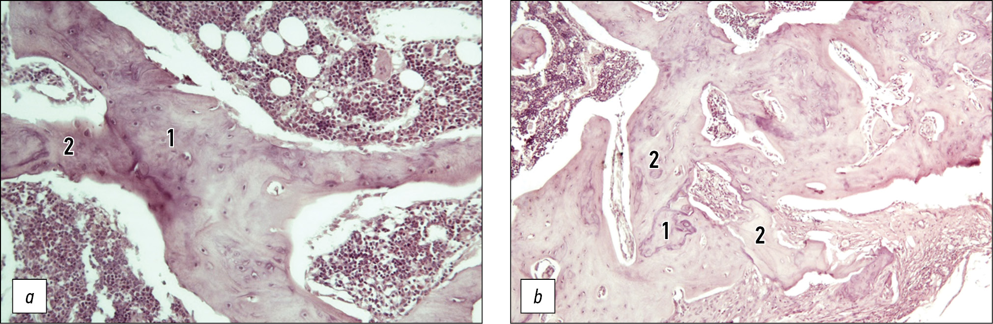 Fig. 8. Histological examination. Bone implantation. Standard light microscopy. Magnification ×200. Hematoxylin-eosin staining: a — on the 14th day (1 — fragment of the implant, 2 — newly formed bone on the surface of the implant); b — on day 30 (1 — implant fragment, 2 — newly formed bone).