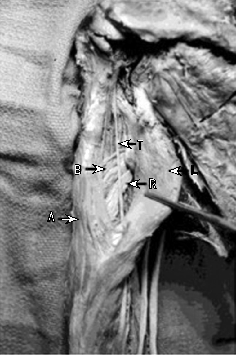 Fig. 1. Photograph of the proximal aspect of the posterior compartment of the left arm demonstrating the proximal attachment of the fourth head of the triceps brachii tendon (T) in relation to the radial nerve (R), deep brachial artery (B), long head muscle belly (L) and lateral head muscle belly (A) [4].