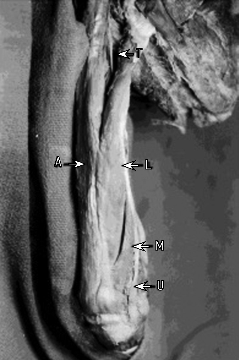 Fig. 2. Photograph of the distal aspect of the posterior compart-ment of the left arm demonstrating the muscle belly of the fourth head of the triceps brachii muscle (M) and the tendon of the fourth head (T) in relation to the muscle belly of the long head (L) and the muscle belly of the lateral head (A) and the ulnar nerve (U) [4].