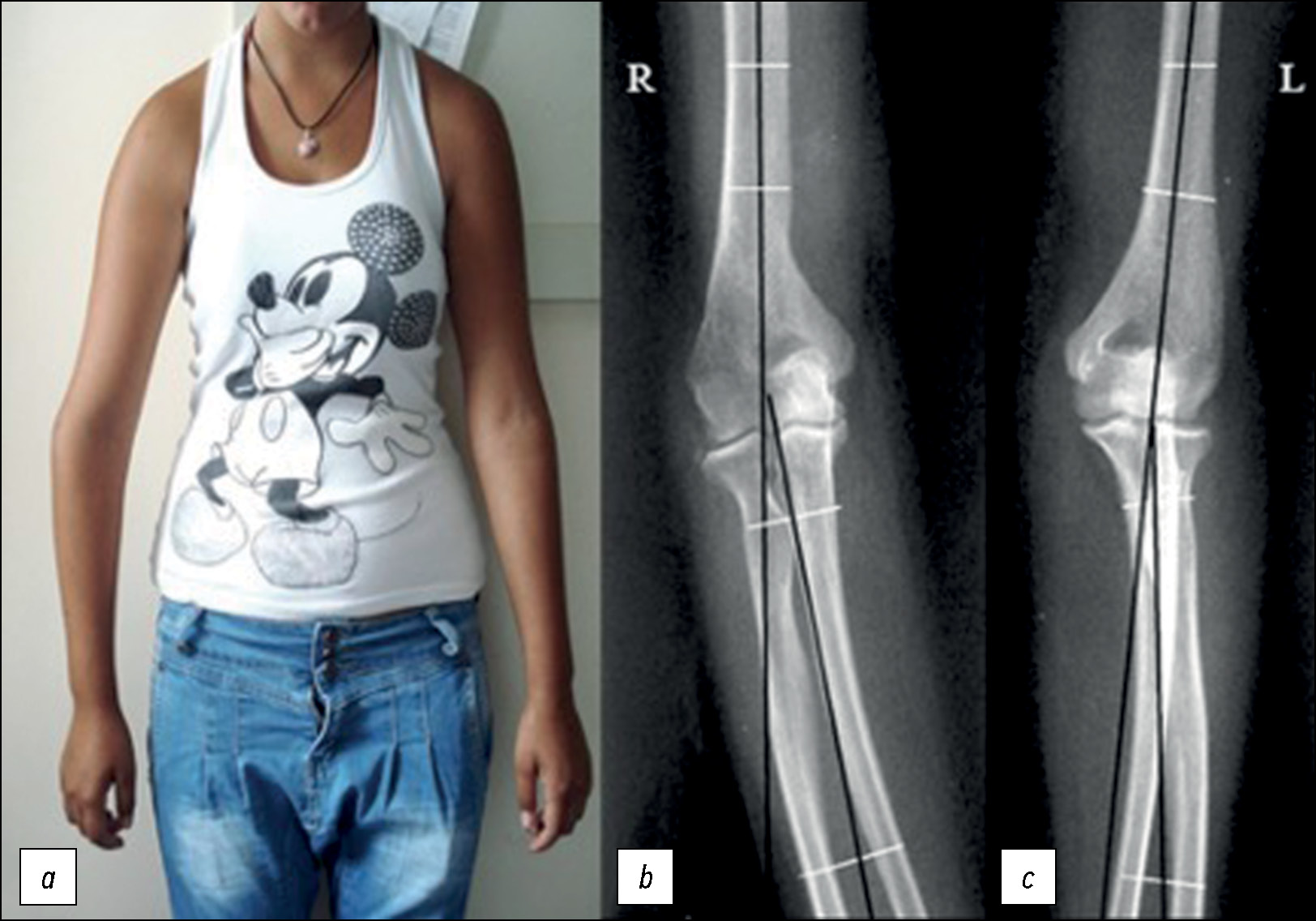 Рис. 3. a — клиническое фото, демонстрирующее деформацию правого локтевого сустава; переднезадние рентгенограммы правого (R) и левого (L) локтевых суставов: b — 12° varus-деформация на правом локте, c — 8° valgus-деформация на левом локте [6].
