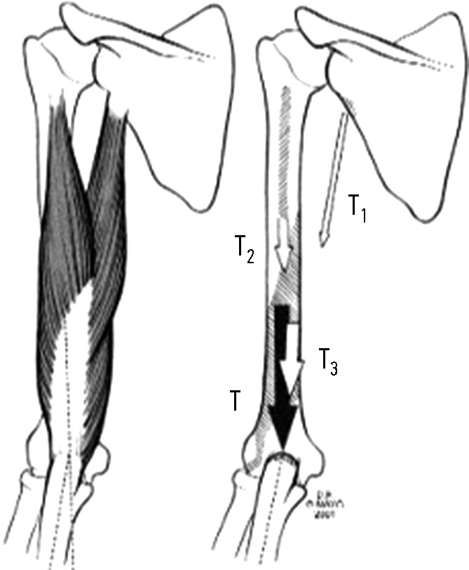 Fig. 4. The T angle summates the direction of pull of the 3 heads of the triceps (Т1, Т2, and Т3) and represents the line of pull of the entire triceps to its position of attachment [5].