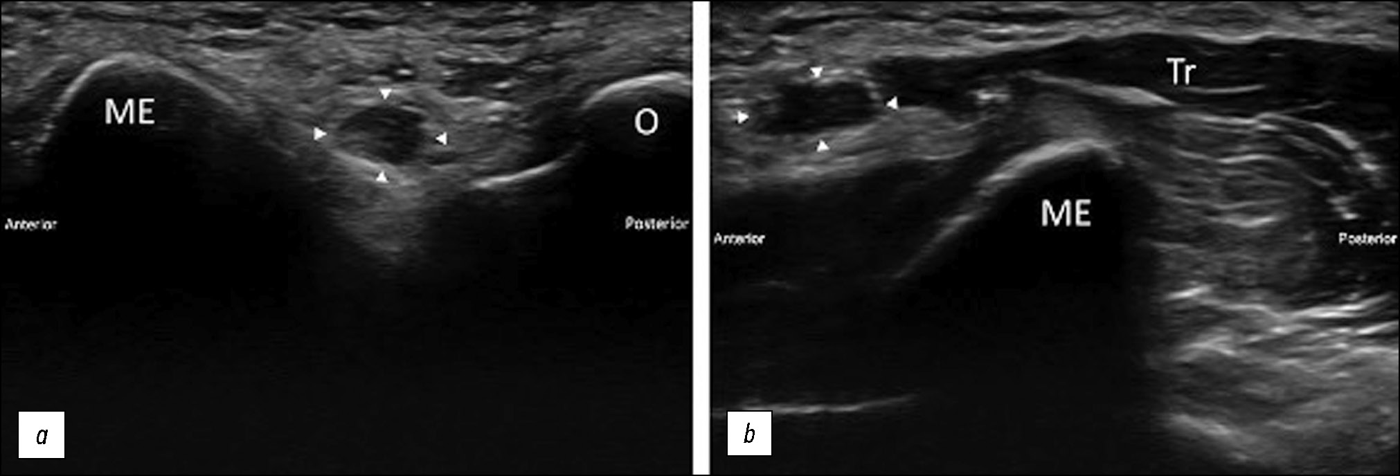 Рис. 5. Ультразвуковое изображение медиальной части локтевого сустава: a — при разгибании в локтевом суставе локтевой нерв (указанный стрелкой) располагается между медиальным надмыщелком плечевой кости (МЕ) и локтевым отростком локтевой кости (О), локтевой нерв выглядит отёчным и гипоэхогенным; b — во время сгибания в локтевом суставе локтевой нерв (указанный стрелкой) и медиальная часть трёхглавой мышцы (Tr) скользят вперёд по медиальному надмыщелку (ME) [10].