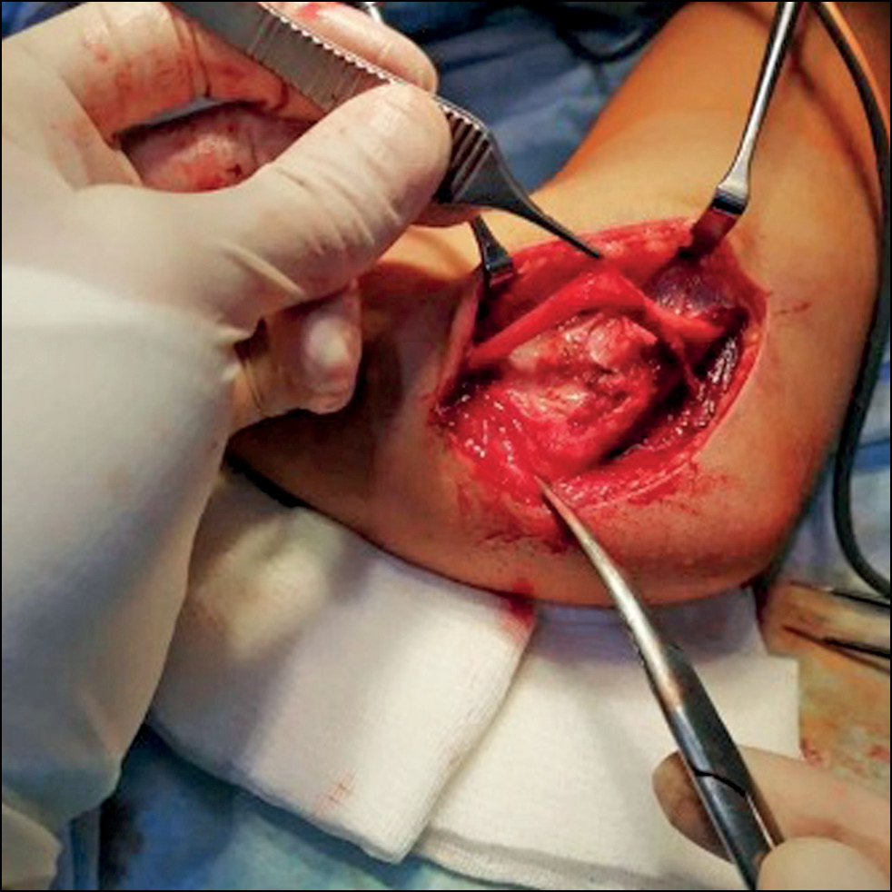 Доступ — продольный прямой по медиальной поверхности нижней трети плеча в проекции борозды локтевого нерва. Вскрывается кубитальный канал, где локтевой нерв обычно смещён кпереди от локтевой борозды. Нерв освобождается проксимально и дистально на 5 см от краёв раны в мышечном канале (рис. 6). Выполняется краевая резекция сухожилия трицепса и мышечной массы. Оцениваем мобильность сухожилия относительно надмыщелка при сгибании. Ушиваем мышечный край. Следующим этапом выполняется транспозиция локтевого нерва кпереди от медиального надмыщелка под фасциальный Z-лоскут (рис. 7). Послойный шов раны. Асептическая повязка.