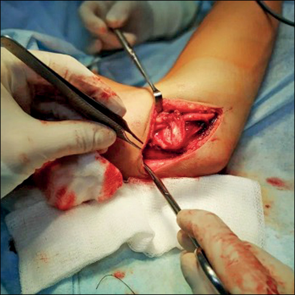 Fig. 7. Intraoperative photograph: the ulnar nerve is transposed and placed under a fascial Z-flap.