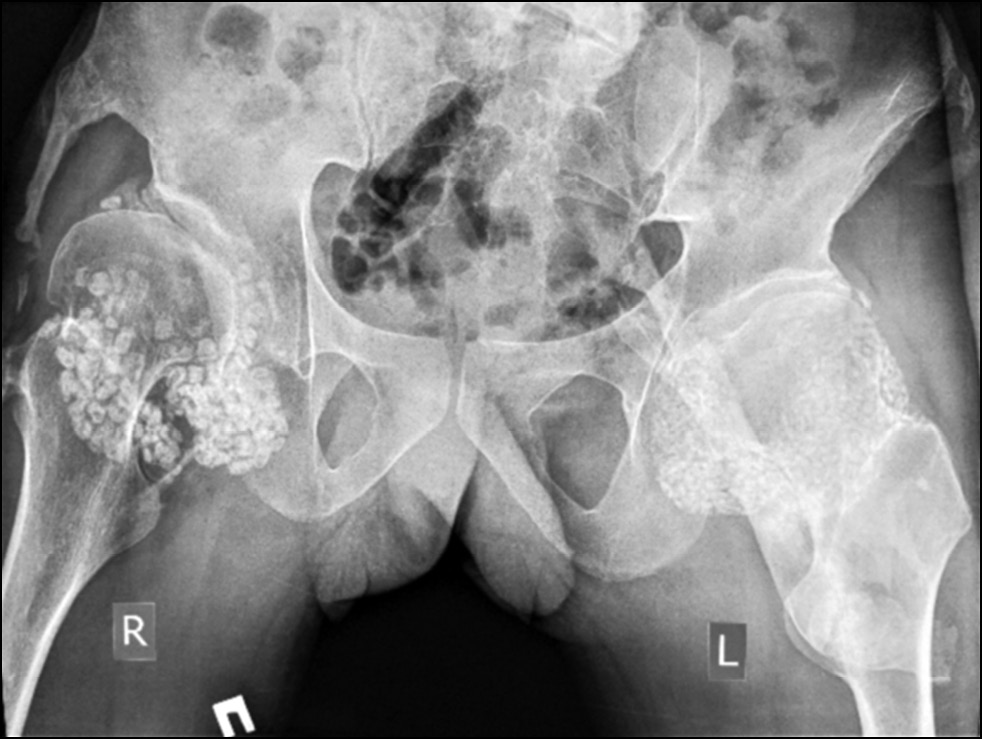 Fig. 6. Radiography of hip joints: marked synovial chondromatosis of both hip joints, heterotopic ossificates in the pelvis and hip joints.