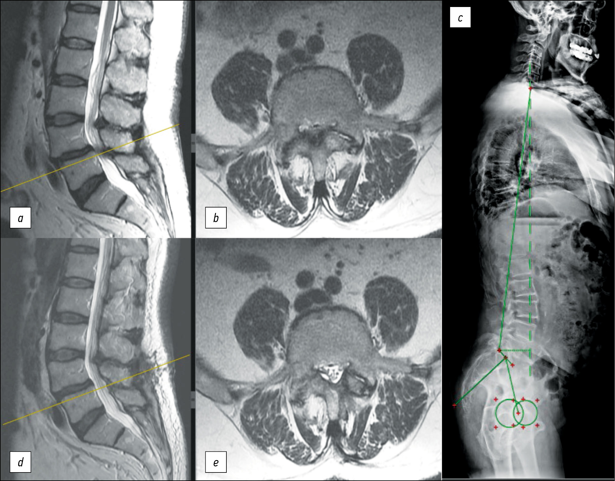 Рис. 1. Пациент Б., 83 года: ВАШ спины — 5 баллов, ВАШ ноги — 8 баллов, ODI=47,5%, DN4 — 2 балла; a, b — МРТ поясничного отдела позвоночника — дегенеративный стеноз на уровне L4-L5 степени D по Schizas, дегенеративный спондилолистез L4 I степени; с — постуральная рентгенография позвоночника — индекс Barrey=1,76, хирургическое лечение — микрохирургическая декомпрессия «over-the-top» на уровне L4-L5; d, e — МРТ поясничного отдела позвоночника через 1 год — рекалибрация позвоночного канала до степени А4 по Schizas, ODI — 4,0%, ВАШ ноги — 0 баллов, ВАШ спины — 3 балла. Достигнут клинический успех — регресс по ODI на 43,50%, рекалибрация позвоночного канала, удовлетворённость оперативным лечением по шкале Ликерта — 5 («гораздо лучше, чем перед операцией»). Достигнут успех лечения.