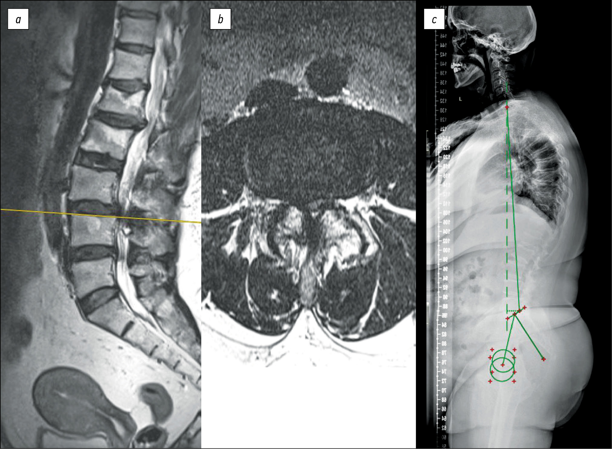 Рис. 2. Пациентка И., 62 года: ВАШ спины — 4 балла, ВАШ ноги — 5 баллов, ODI=64,44%, DN4 до операции — 7 баллов; a, b — МРТ поясничного отдела позвоночника — дегенеративный стеноз на уровне L3-L4 степени С по Schizas; с — постуральная рентгенография позвоночника — индекс Barrey=0,71. Хирургическое лечение — микрохирургическая декомпрессия «over-the-top» на уровне L3-L4. Несмотря на достигнутую рекалибрацию до степени B по Schizas, у пациентки сохраняются боли в нижних конечностях. ODI — 48,89%, ВАШ ноги — 4 балла, ВАШ спины — 3 балла. Клинически успех достигнут — регресс по ODI на 15,5%, достигнута рекалибрация позвоночного канала, однако пациентка результатом оперативного лечения не удовлетворена — 3 по шкале Ликерта («состояние без изменений»). Сохраняется высокое значение нейропатической боли: DN4=7 баллов. Хирургическое лечение признано неуспешным.
