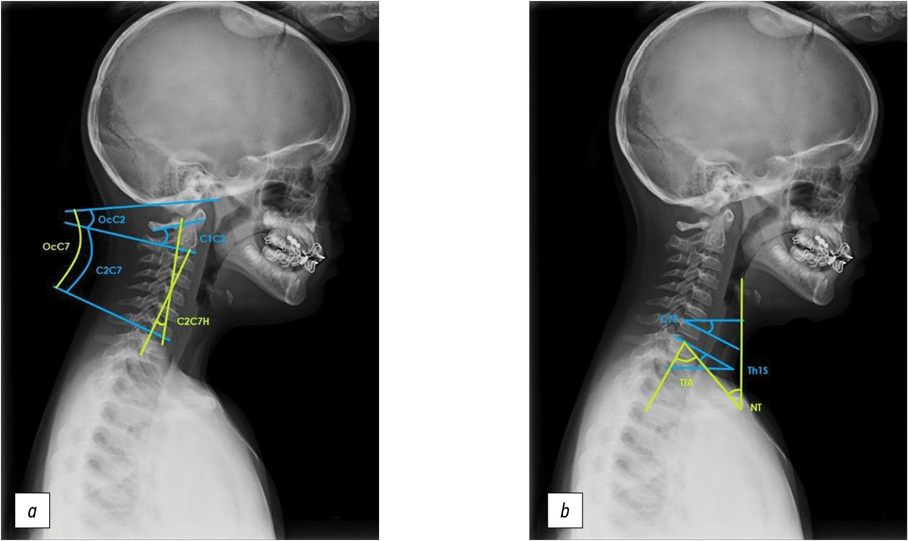 Radiographs of the cervical spine in a neutral position in a lateral view and postural radiographs of 110 pediatric patients were analyzed. Radiographs taken in an upright position, with the head in a neutral position, were selected. The selected radiographs capture the skull base, entire cervical spine, and upper thoracic spine with the manubrium of the sternum. The patients were distributed into two groups.