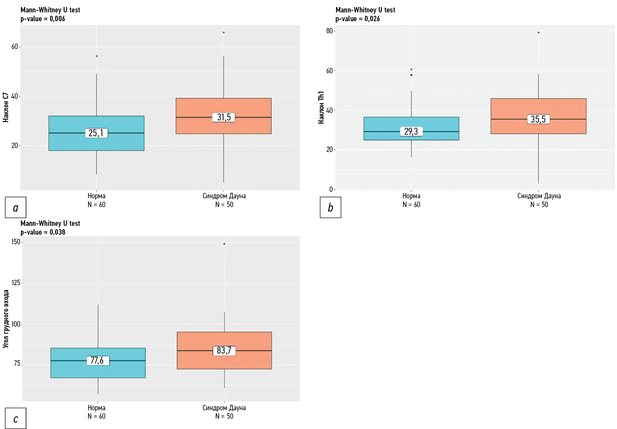 5. Fig. 4. Graphs of statistically significant differences in cervical sagittal balance parameters between groups presented using the Mann–Whitney test: a — C7 tilt (C7S), b — Th1 tilt (Th1S), c — thoracic inlet angle (TIA).