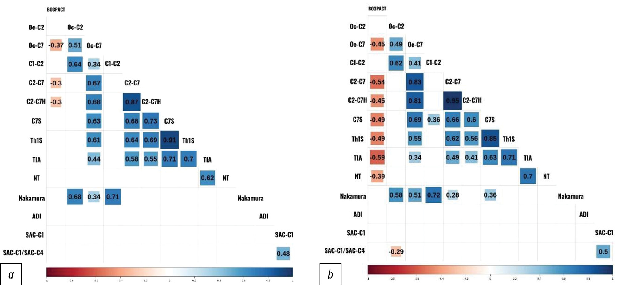 7. Fig. 6. Representation of statistical relationships between all investigated parameters in groups using Spearman’s rank correlation coefficient: a — group 1 (normal), b — group 2 (Down syndrome).