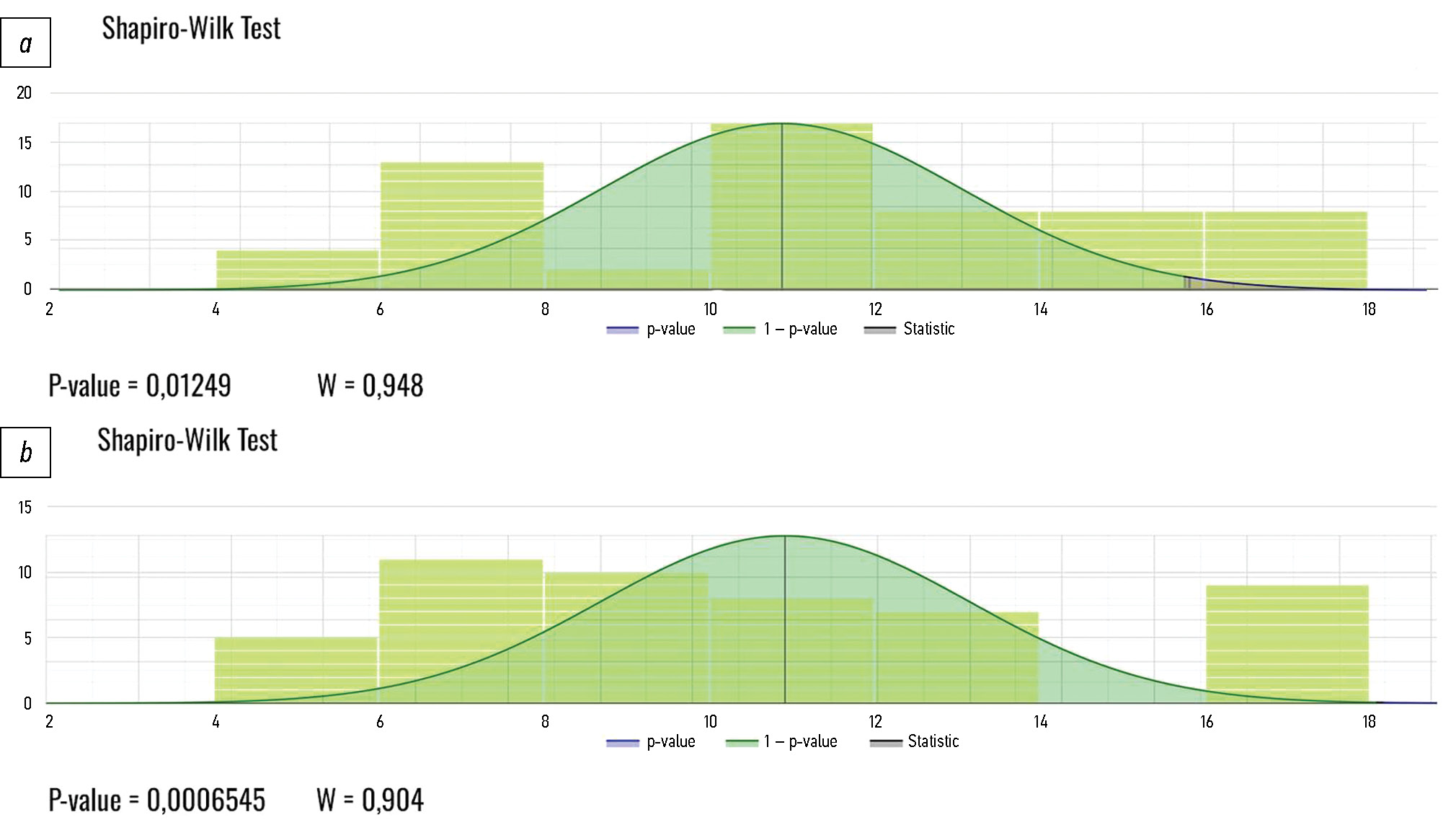 Fig. 3. Evaluation of normality of age distribution in the groups using with Shapiro–Wilk test: a — group 1 (normal), b — group 2 (Down syndrome).