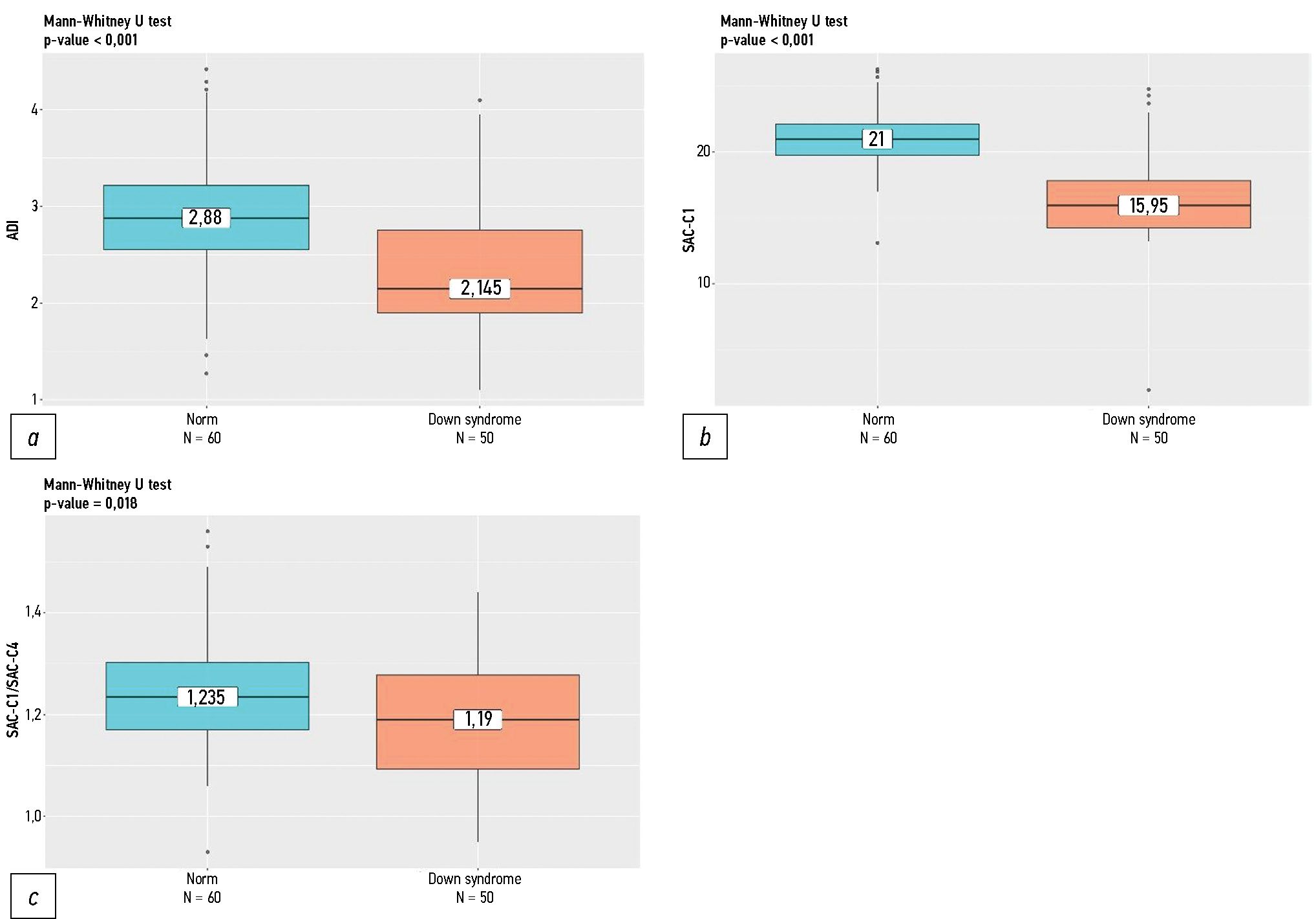 6. Fig. 5. Graphs of statistically significant differences in atlantoaxial instability criteria presented using the Mann–Whitney test: a — anterior atlantodental interval (ADI), b — space available for cord at C1 level (SAC-C1), c — coefficient of ratio of space available for cord at C1 level and C4 level (SAC-C1/SAC-C4).