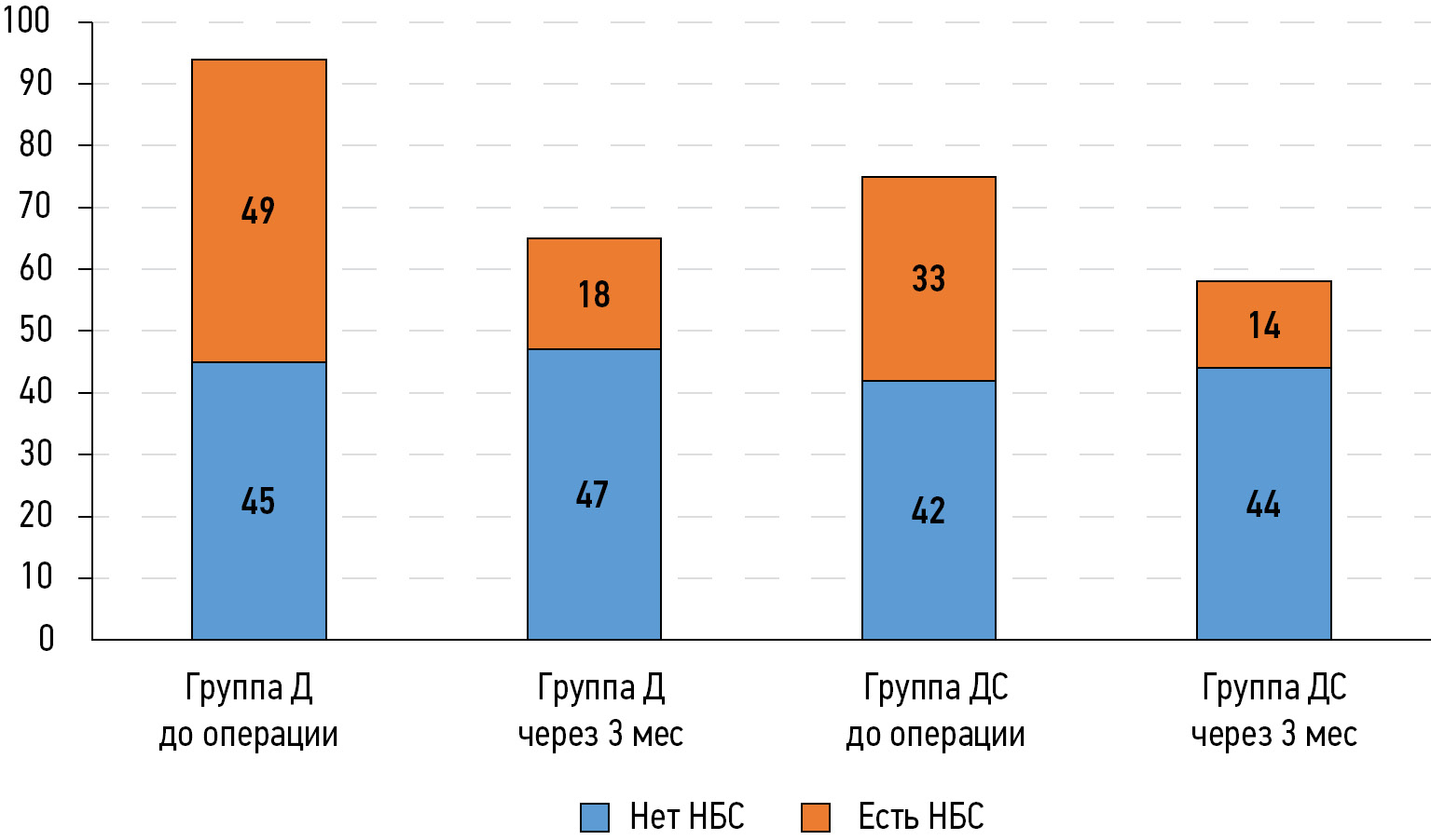 Initially, 48.5% (82/169) of the patients showed signs of NPS (DN4>4) (Fig. 1). Postoperatively, the proportion of patients with NPS significantly decreased to 26% (32/123) in the total cohort. The proportions of patients with NPS at 3 months postoperatively were comparable in groups D and DS (27.7% (18/65) and 24.1% (14/58), respectively, p=0.669). In addition, NPS persisted in 7.3% (6/82) of the patients and reappeared in 13% (16/123) of the patients. Thus, depending on the dynamics of NPS, the number of patients changes between groups.