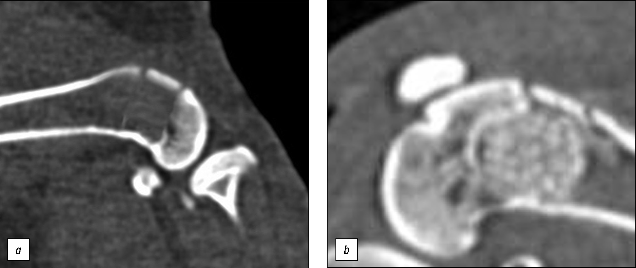 Fig. 1. CT of the metaphyseal defect area: a — the zone of compression defect of the distal metaphysis of the femur of a laboratory animal, group 1 (CT-scan), b — the zone of compression defect of the distal metaphysis of the femur of a laboratory animal, group 3 (CT-scan).