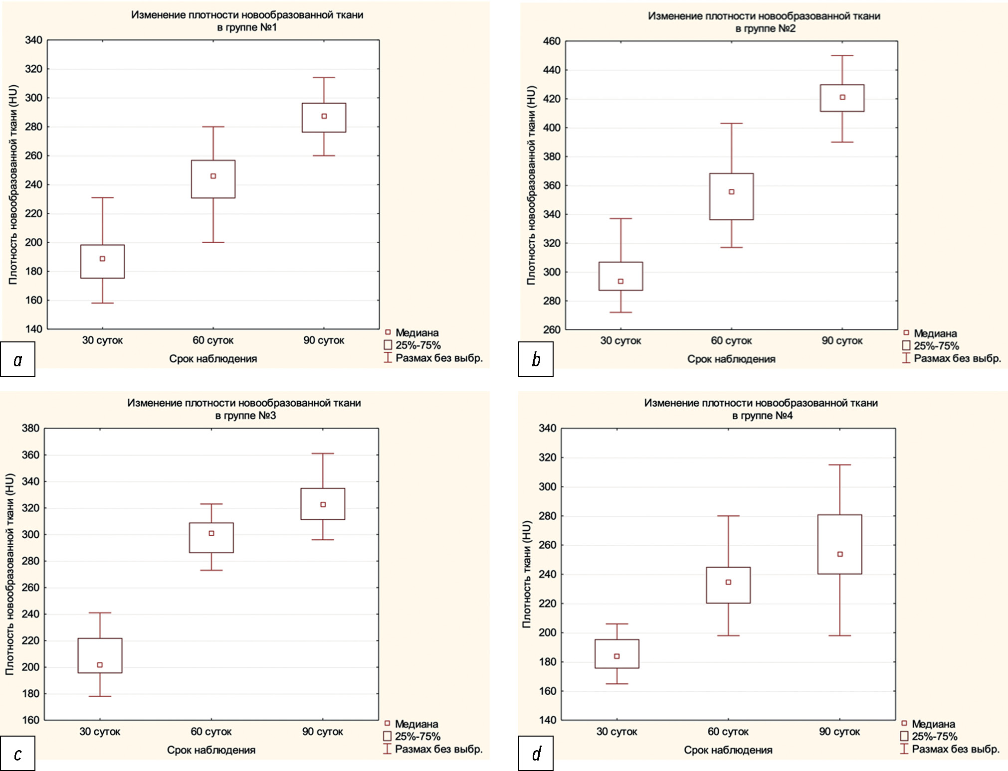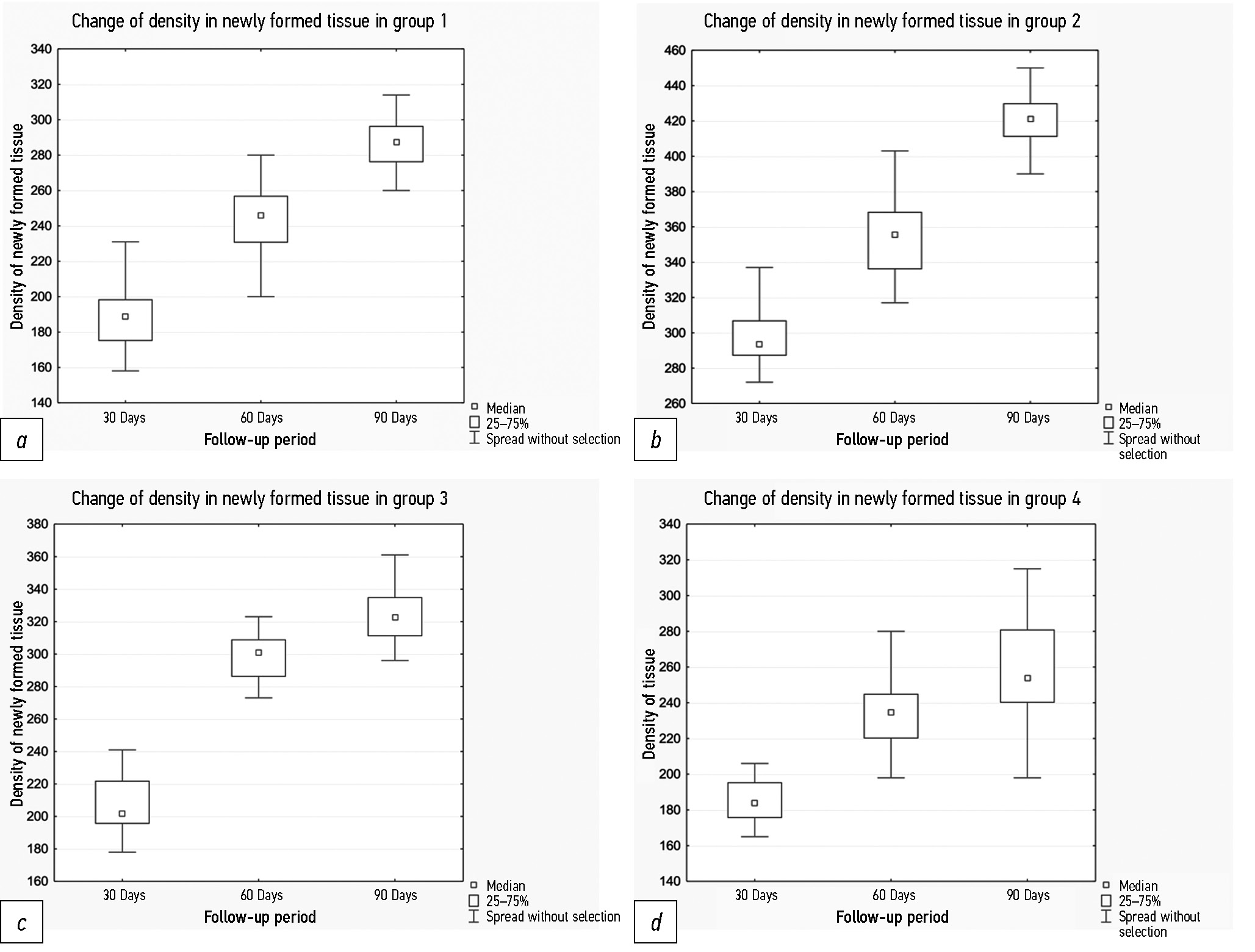 Moreover, less positive dynamics of osteogenesis was recorded in group 4 (Fig. 2d) according to MSCT data. On day 30 of follow-up, the average value of the density of newly formed tissue was almost two times lower than the density of unformed spongy bone and amounted to 184.0 [175.5; 195.5] HU. An 18% increase by day 60 and a less obvious 7% improvement by day 90 allowed this indicator to approach only a little closer; however, it still did not correspond to the bone density of type 4 according to the classification of S. Misch.