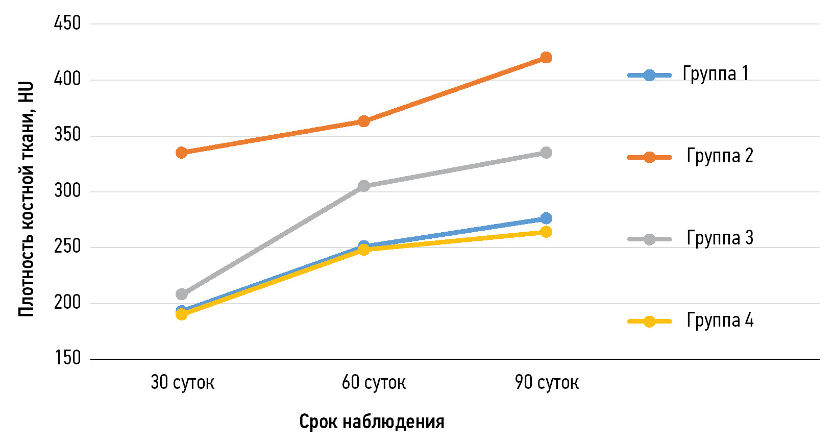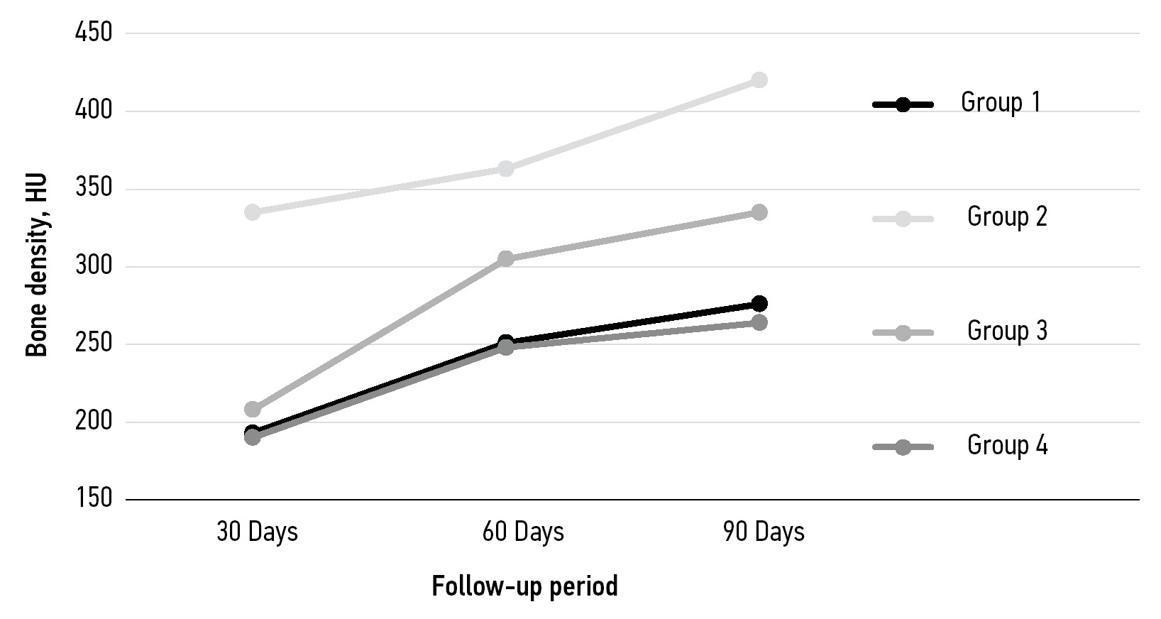In assessing the dynamics of the studied indicators in different groups, it should be noted that by day 30 of the experiment, the average value of bone density in group 2 significantly exceeded the similar result in other groups (p <0.01); however, the growth of the parameter in question in days 30–60 was most pronounced in group 3 (p=0.0474), milder in groups 1 and 4 (p=0.0481), and weaker in group 2 (p=0.0491). In days 60–90, the greatest increase in bone density was registered in group 2 (p=0.042), and less intense and almost identical dynamics were revealed in the other experimental groups (p=0.046). Moreover, the final integrative indicators in days 60 and 90 indicated complete replacement of the defect with newly formed bone tissue with obvious signs of the beginning of organotypic restructuring in group 2 (p <0.01). The studied indicators in groups 1 and 4 demonstrated similar dynamics and very close values at the control points of the study, confirming the slow, incomplete, and uneven replacement of the defect with unformed spongy bone (p=0.048). In group 3, despite a significant increase in bone density in days 30–60 of follow-up, which reached 63.8%, the final result by day 90 (with an increase dynamics of 22.2% from days 60–90) did not reach the reference values characteristic of unformed spongy bone (p=0.046) (Fig. 3).