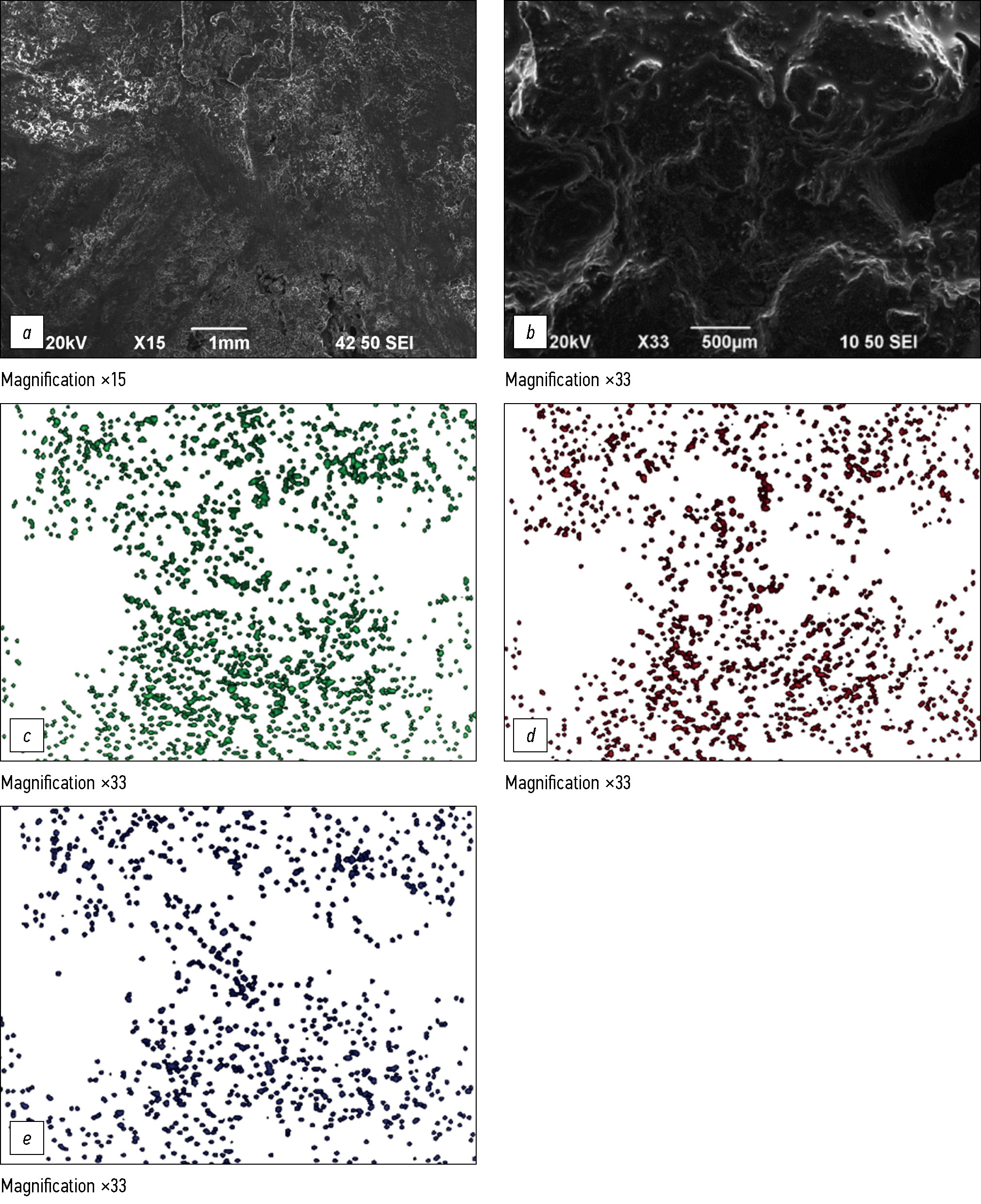 Some studies have shown that the use of implantable materials based on composites, including calcium phosphate and silicate, in replacing bone tissue defects shows comparatively better results than their separate use [13, 34, 35]. The combined use of these substances can potentiate the strengths of each of the components and relatively neutralize the weaknesses. Accordingly, the study of the features of changes in the amounts of phosphorus, calcium, and silicon in growing bone tissue can provide indirect information on the features of its regeneration and the dependence of the elemental composition on the stage of the process and determine the optimal ratio of the studied components in the implant composition. A highly informative tool for such a study is the combined SEM-EDA method, which allows visualization of the surface morphology of biological object samples, identification of the qualitative and quantitative elemental composition of their surface layer, and collection of data on the integral and local distribution of atoms of chemical elements in the mapping mode [36].