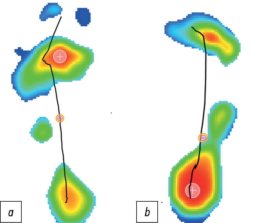 Рис. 3. Динамическая педобарография обеих стоп до проведённого лечения: а — левая стопа, b — правая стопа. Отмечается увеличение времени контакта, среднего давления, показателей коэффициента «интегральное давление/время в заднем отделе правой стопы».