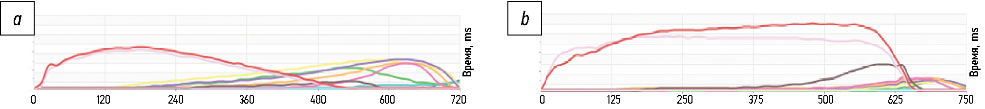 Рис. 4. Графики динамической педобарографии до лечения: а — левая стопа, b — правая стопа. Определяется значительное увеличение времени контакта и максимального давления заднего отдела правой стопы. При этом отмечается более высокое максимальное давление по наружному краю заднего отдела стопы (красная линия графика) в сравнении с внутренним краем (розовая линия).