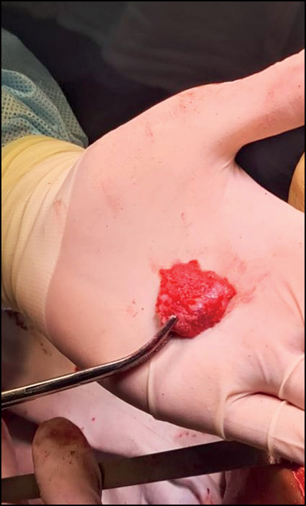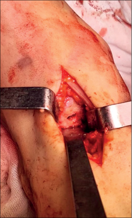 Наружно-боковым доступом был выделен передний суставной отросток пяточной кости и произведена его остеотомия. Это позволило мобилизовать и вывести в рану культю головки и шейки таранной кости без дополнительного рассечения связочного аппарата стопы. У данного пациента в головке таранной кости была обнаружена и интраоперационно выделена киста. Была выполнена её экскохлеация до кровоточащей костной ткани (рис. 6).