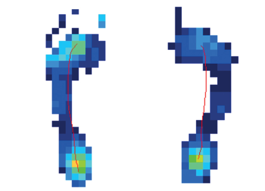 В переднем отделе правой стопы определяется значимое уменьшение времени контакта и пикового давления в сравнении с левой стопой. При этом отмечается выраженное снижение максимального давления в переднем отделе правой стопы, что отображает уменьшение пропульсивной фазы шага. Для правой стопы данный показатель был равен 197 кПа, что на 53,7% меньше, чем для контралатеральной конечности в её переднем отделе.