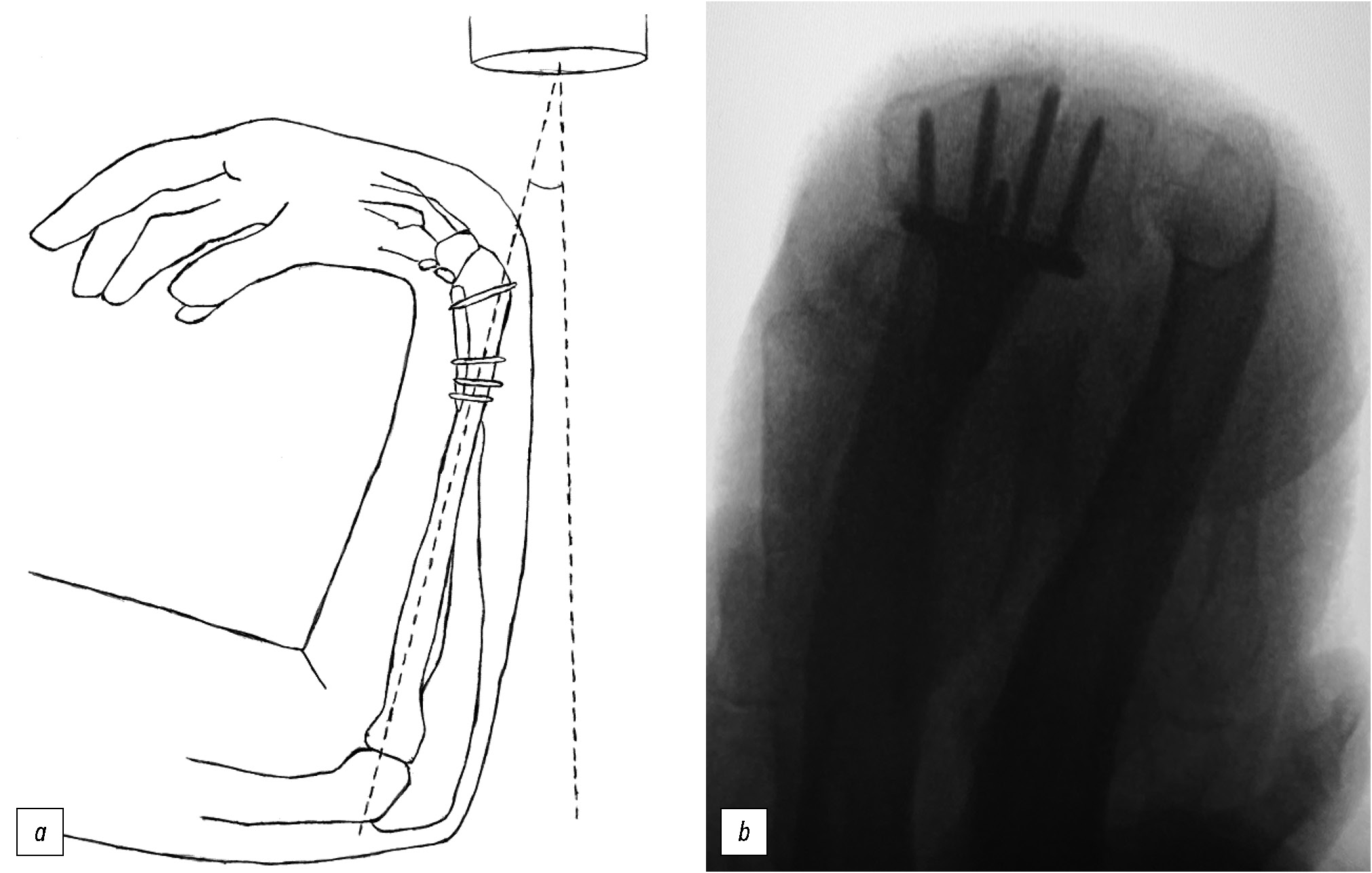 Fig. 3. Dorsal tangential view: a — schematic representation, b — C-arm image.
