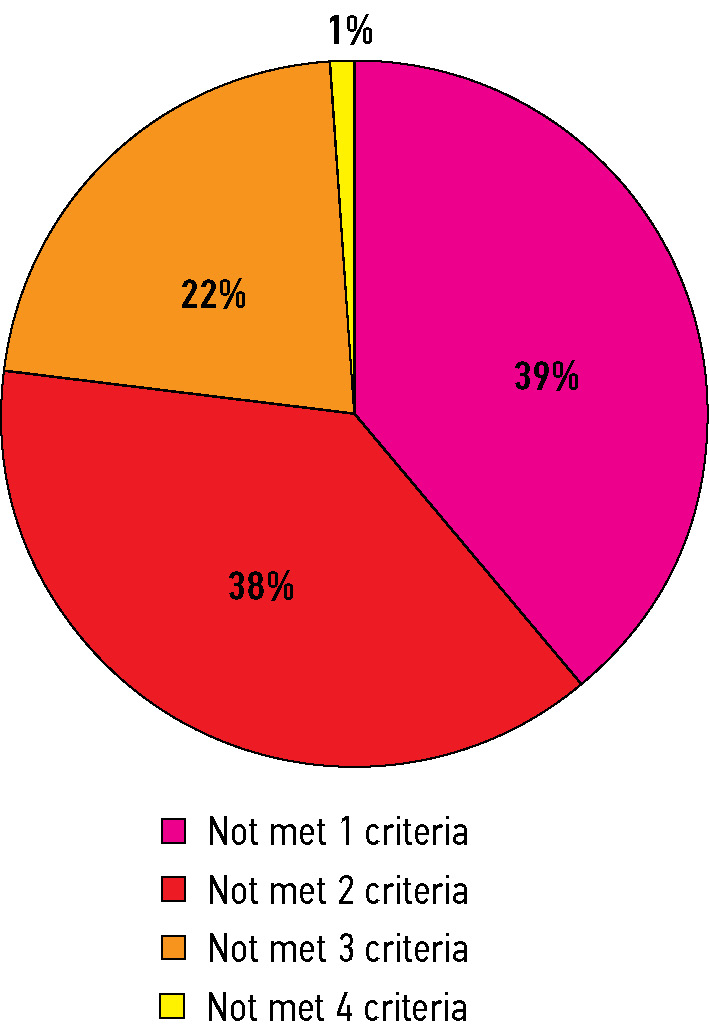 Among the knees identified as unsuitable for OUKA (51%), 40% (79 knees) failed to meet a single radiographic criterion, 38% (75 knees) fell short of meeting two criteria, 22% (43 knees) did not meet the three criteria, and an insignificant portion <1% (1 knee) did not fulfill the four criteria (Fig. 5).