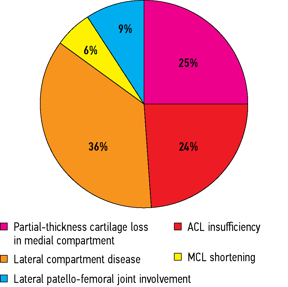 In knees that did not meet the radiographic criteria, observations were as follows: 67 knees (46%) showed partial-thickness cartilage loss in the medial compartment, 69 (45%) exhibited posterior bone loss on true lateral radiographs, signifying ACL insufficiency, 113 (67%) displayed evidence of lateral compartment disease, 21 (11%) demonstrated signs of MCL shortening, and 31 (16%) exposed evidence of bone loss with grooving affecting the lateral patello-femoral joint (Fig. 6).