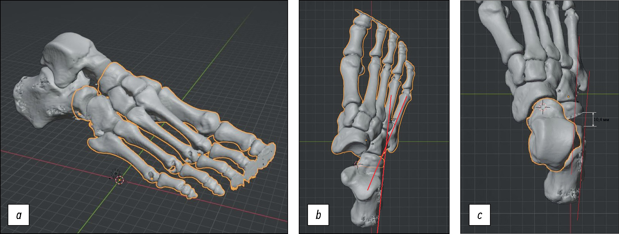 Fig. 1. Stages of preoperative modeling: а — preparation of a three-dimensional model, choice of osteotomy level, b — determination of the cuboid abduction angle, c — diastasis modeling.