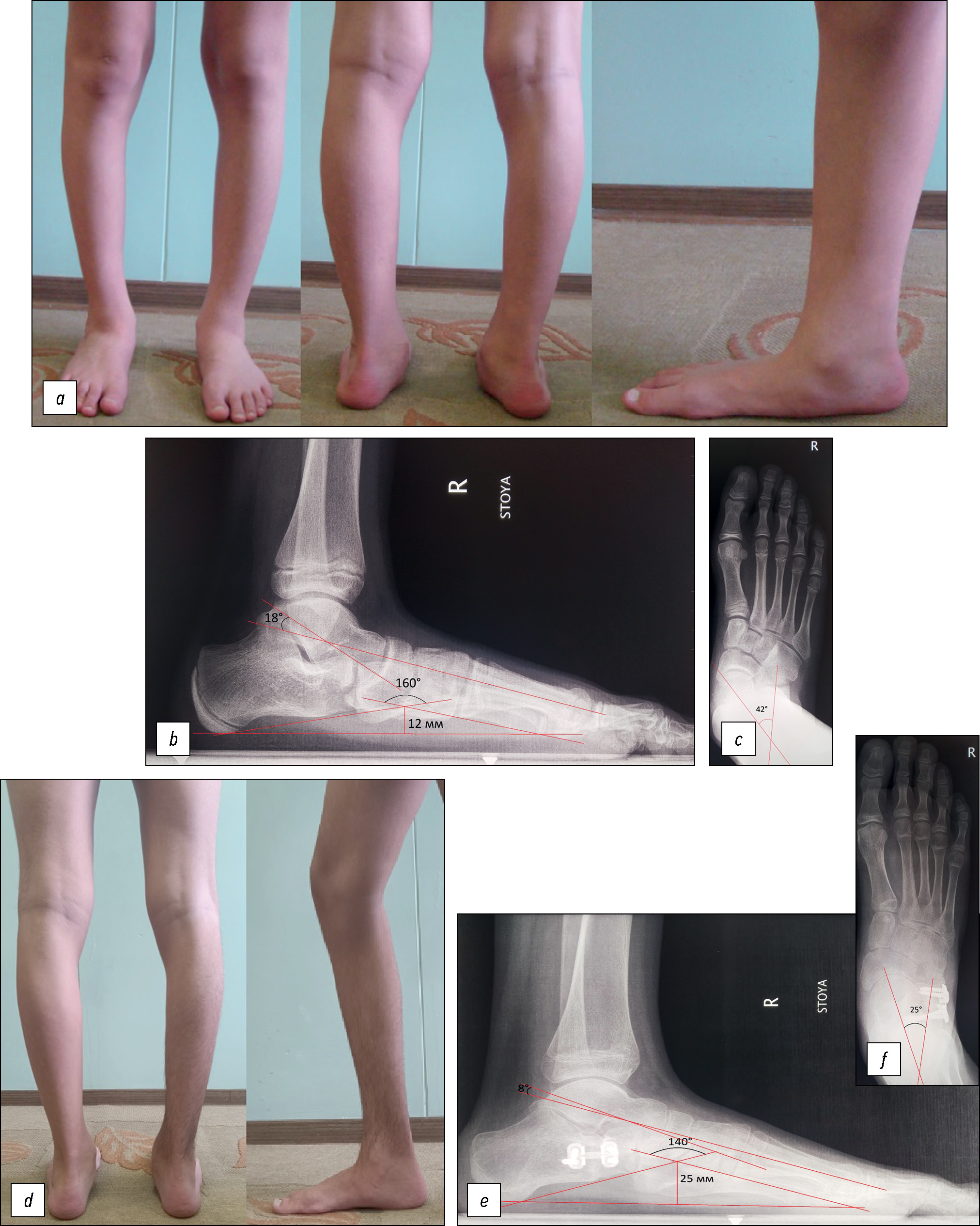 Fig. 2. Patient S., 13 years, diagnosis — planovalgus foot deformity: a — view of the foot before surgery, b — radiography before surgery with a load (lateral projection), c — radiography before surgery with a load (AP projection), d — patient appearance 6 months after surgery, e — radiography after 6 months with a load (lateral projection), f — radiography after 6 months with a load (AP projection).