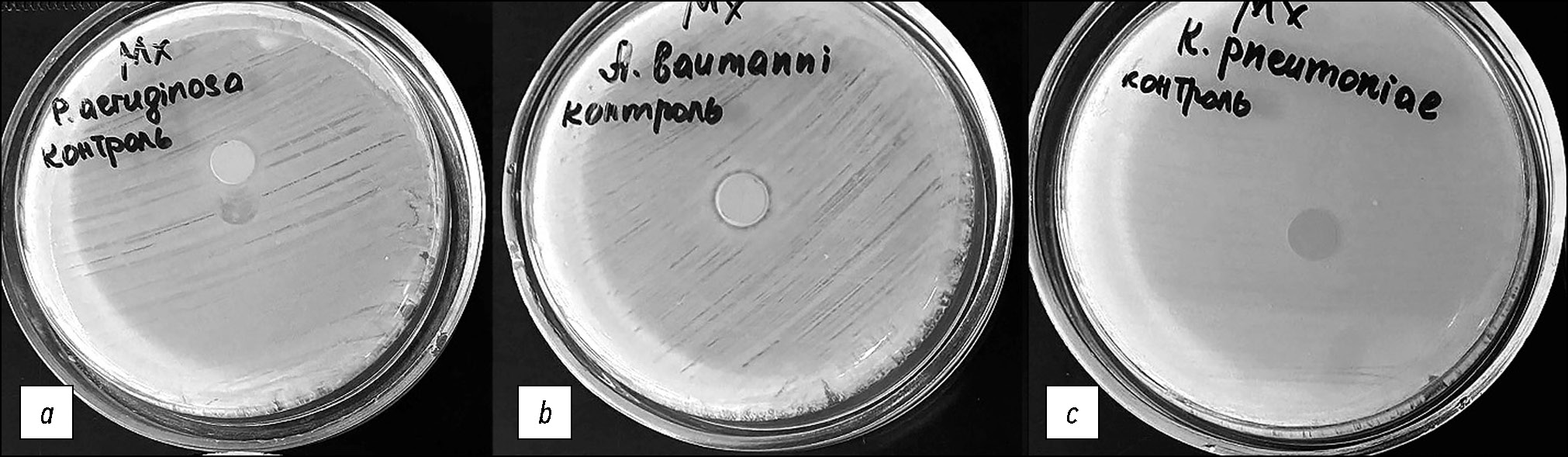 Fig. 1. Control group: a — Pseudomonas aeruginosa, b — Acinetobacter baumannii, с — Klebsiella pneumoniae.