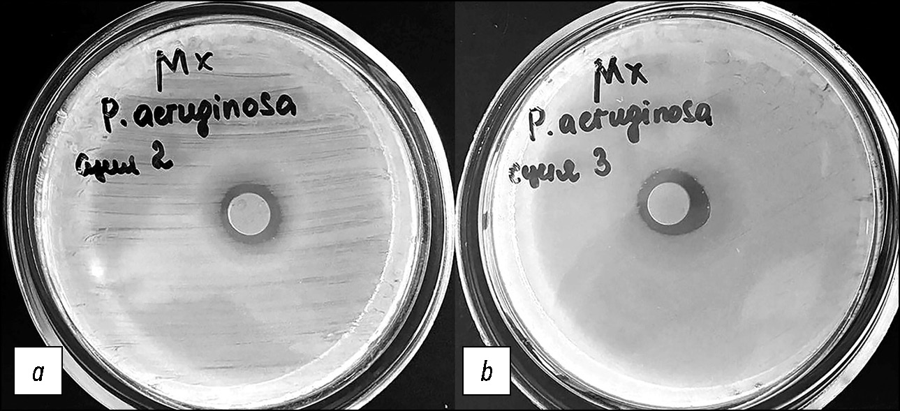 Рис. 2. Воздействие амикацина в составе композитного покрытия на музейные культуры Pseudomonas aeruginosa: a — концентрация 5,0 мкг, b — концентрация 7,5 мкг.