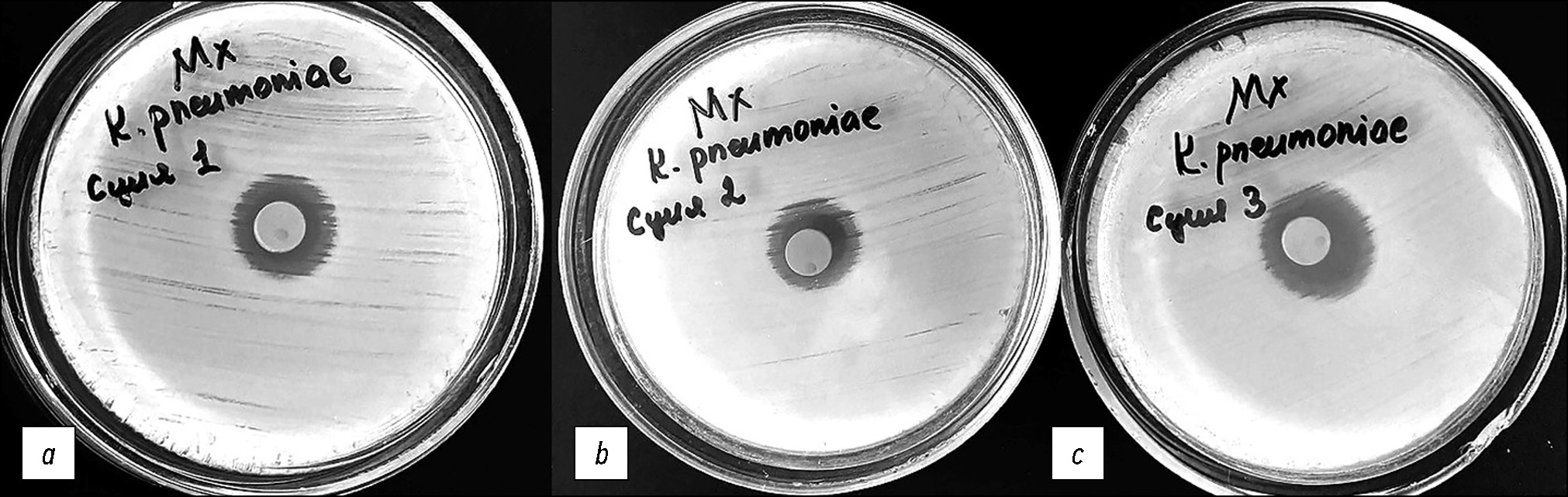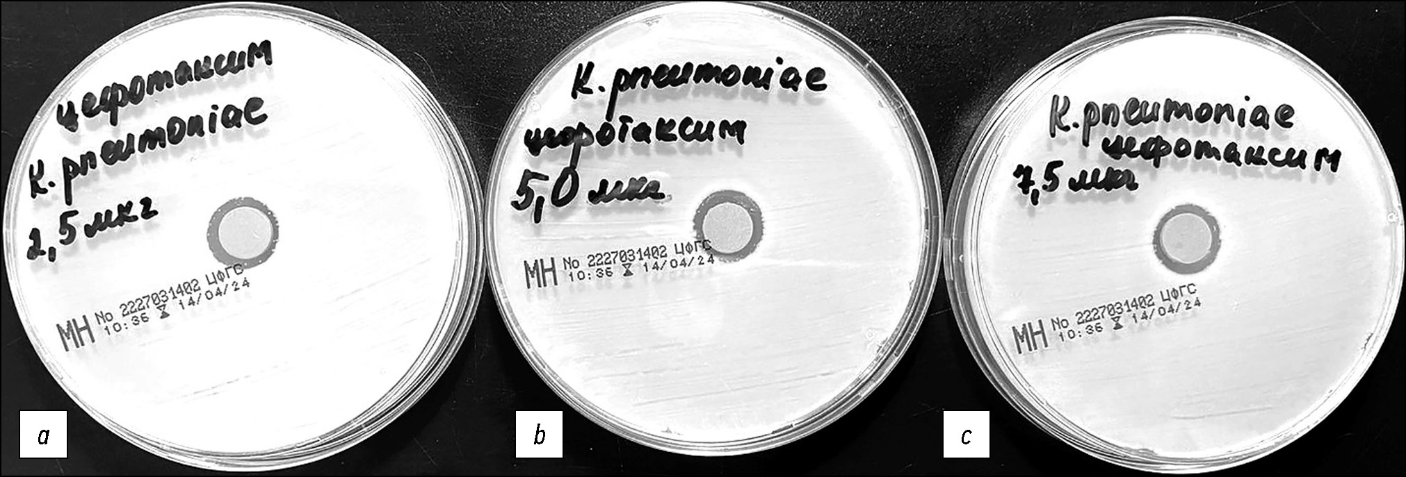 Цефотаксим в тестируемых концентрациях подавлял рост микробных культур K. pneumoniae (рис. 5). В отношении бактерий P. aeruginosa и A. baumannii диски с цефотаксимом в исследуемых концентрациях были неэффективны.